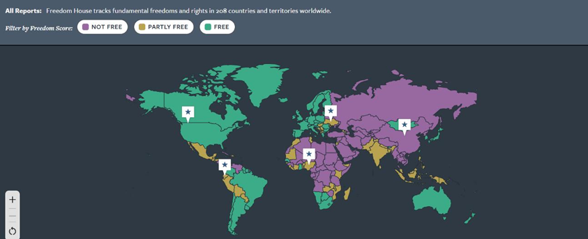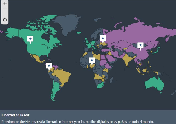 Por su parte, Freedom House es una organización estadounidense establecida en 1941 que se dedica a promover la democracia y realizar informes periódicos sobre diversos derechos civiles. Uno de sus proyectos más destacados es Freedom on the Net, un análisis anual que evalúa la libertad en internet en 72 países. A diferencia de otras instituciones, su clasificación se divide en tres categorías identificadas por colores: libre en verde, parcialmente libre en naranja y no libre en morado. Su sistema de medición se centra específicamente en los obstáculos de acceso, los límites de contenidos y las violaciones a los derechos de los usuarios, ofreciendo informes detallados que, aunque no cubren la totalidad del globo, permiten profundizar en la realidad digital de las naciones analizadas hasta el año 2025.
