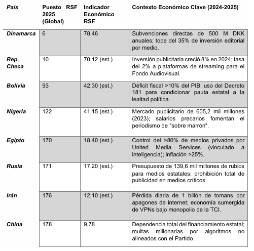 El análisis global revela una crisis estructural en la libertad de prensa dividida en tres grandes bloques: las democracias europeas con altos estándares pero desafíos digitales, los regímenes autoritarios que aplican un modelo de represión legalizada, y naciones intermedias donde la precariedad y la violencia erosionan las garantías básicas. En el ámbito jurídico y político, mientras países como Chequia y Dinamarca buscan proteger la independencia, estados como China, Rusia, Egipto e Irán utilizan leyes antiterroristas y de ciberdelincuencia para criminalizar el periodismo, una tendencia que en menor medida también afecta a Bolivia y Nigeria a través de la manipulación judicial. Económicamente, la censura varía desde el monopolio estatal y la captura de medios por élites en sistemas totalitarios, hasta la vulnerabilidad por bajos salarios y dependencia de publicidad oficial en democracias frágiles, o la presión de gigantes tecnológicos en mercados consolidados. Finalmente, la seguridad muestra una transición de la violencia física y el encarcelamiento masivo en entornos represivos hacia el acoso digital, la vigilancia extrema y la polarización social en el resto del mundo, factores que en conjunto fomentan una cultura del miedo y la autocensura a nivel global.