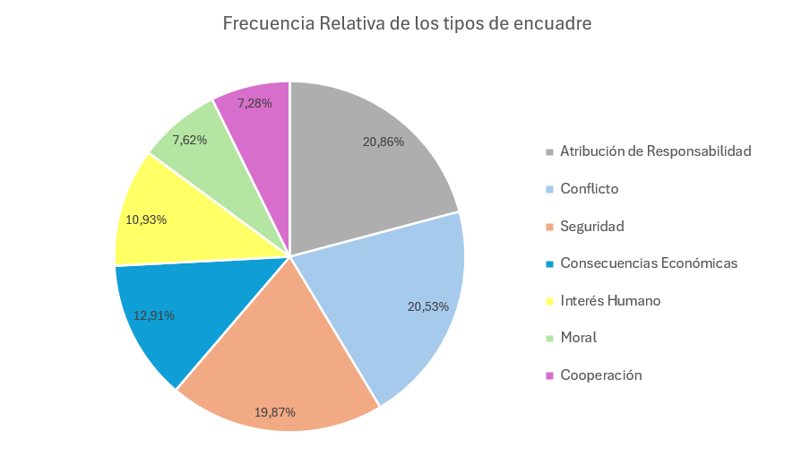 Muy cerca en frecuencia aparece el encuadre de seguridad (19,87%), que amplía la mirada más allá del campo de batalla.