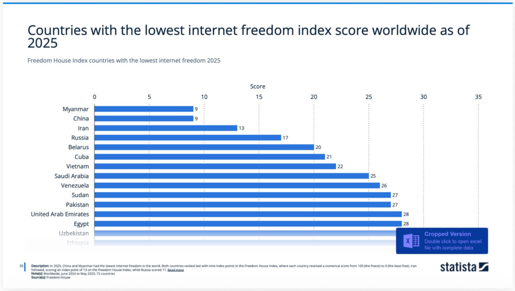 En cuanto a la libertad digital y control estatal, emergen las diferencias estructurales claves, en el que destaca Corea del Sur por tener una alta conectividad y un entorno digital mayoritariamente abierto. China, Irán, Myanmar y Rusia tienen distintos grados de control estatal, censura o bloqueos. En China y Rusia, el control se articula más mediante ecosistemas digitales nacionales. Myanmar e Irán aparecen en el gráfico de países con menor libertad de internet en el Statista. Por lo que estas diferencias demuestran que estar conectado no equivale a estar libremente conectado.