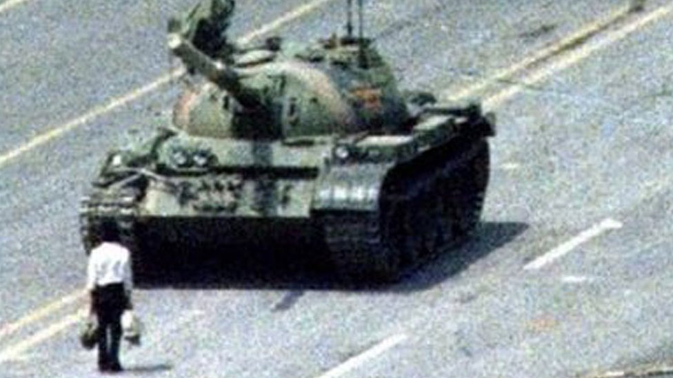 El hombre del tanque. Hombre de identidad desconocida frente a tanques durante las protestas estudiantiles de Tiananmen contra el PCCh, 1989.