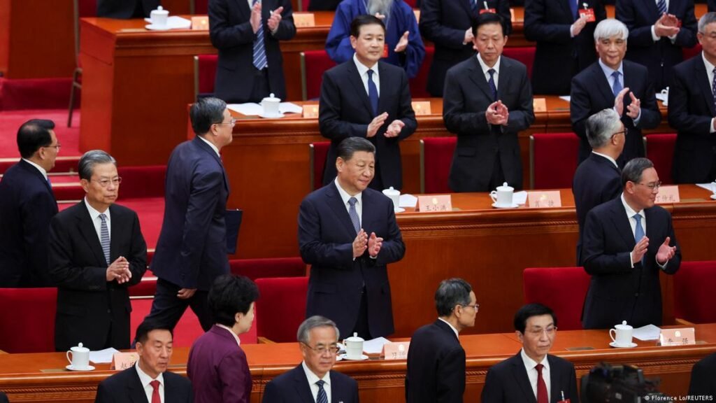 Sesión plenaria del Congreso Nacional del Pueblo con presencia de Xi Jinping: La imagen muestra una reunión oficial del Congreso Nacional del Pueblo de la República Popular China, el máximo órgano legislativo del país. En el centro aparece Xi Jinping, secretario general del Partido Comunista de China y presidente de la República Popular China, acompañado por altos dirigentes del Partido y del Estado.