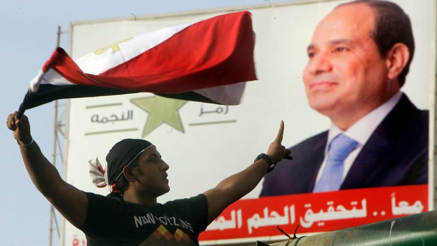 La imagen muestra a un simpatizante ondeando la bandera egipcia frente a un cartel con el retrato de Abdel Fattah el-Sisi, presidente de Egipto desde 2014. El-Sisi es un exmilitar que llegó al poder tras la destitución de Mohamed Morsi y ha consolidado su liderazgo a través de varios procesos electorales.